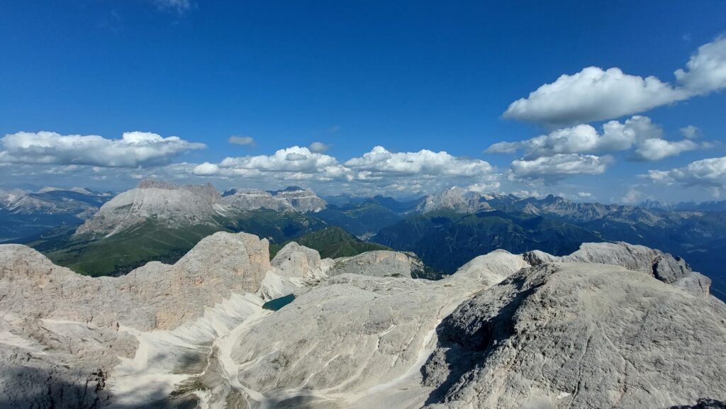 La vista però è straordinaria. Spiccano in primo piano, oltre le vicine Crode del Lago, il Sassolungo/Sassopiatto, il Gruppo del Sella con dietro le Odle, la Marmolada, i Monzoni con dietro le Pale di San Martino. In bella vista il Lago di Antermoia, vero gioiello alpino incastonato al centro del massiccio. A Nord-Ovest, non inquadrato il caratteristico profilo dello Sciliar che sovrasta l’Alpe di Siusi.