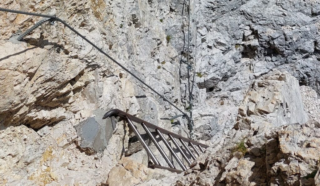 Il primo tratto attrezzato mi consente di superare una cengia un po’ esposta che rappresenta uno dei pochi passaggi impegnativi di tutta la via. Scendo poi di qualche metro tramite una comoda scaletta a pioli che facilita il passaggio e mi riporta sulla cengia che taglia obliquamente questo spigolo di montagna.