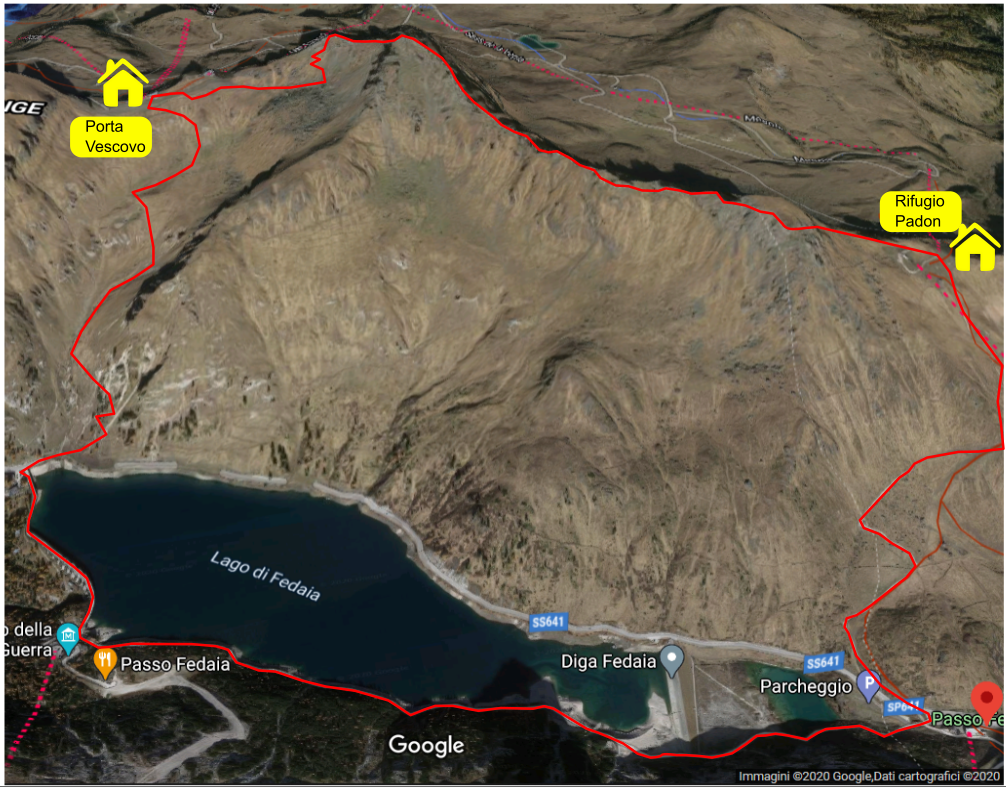 Il lago Fedaia col suo specchio azzurro è il punto di partenza ideale per questa escursione di metà Settembre. Lasciata l’auto nei pressi del lago e preparato l’equipaggiamento inizio a inerpicarmi per il sentiero 698 che sale a Porta Vescovo. Il gruppo Padon-Mesola è caratterizzato da roccia di colore scuro che denota l’origine vulcanica e lo differenzia nitidamente dai circostanti gruppi calcarei dolomitici dal classico colore biancorosato. Maggiormente friabile, questa roccia consente alla vegetazione un facile insediamento, soprattutto alle specie prative che coprono i pendii e le conferiscono un aspetto meno selvaggio. Impiego circa 40 minuti per coprire la distanza e arrivo in prossimità del rifugio, praticamente deserto per la data infrasettimanale. A destra rispetto alla direzione di arrivo trovo un sentiero pianeggiante con il quale raggiungo il punto di attacco della ferrata in circa 20 minuti.